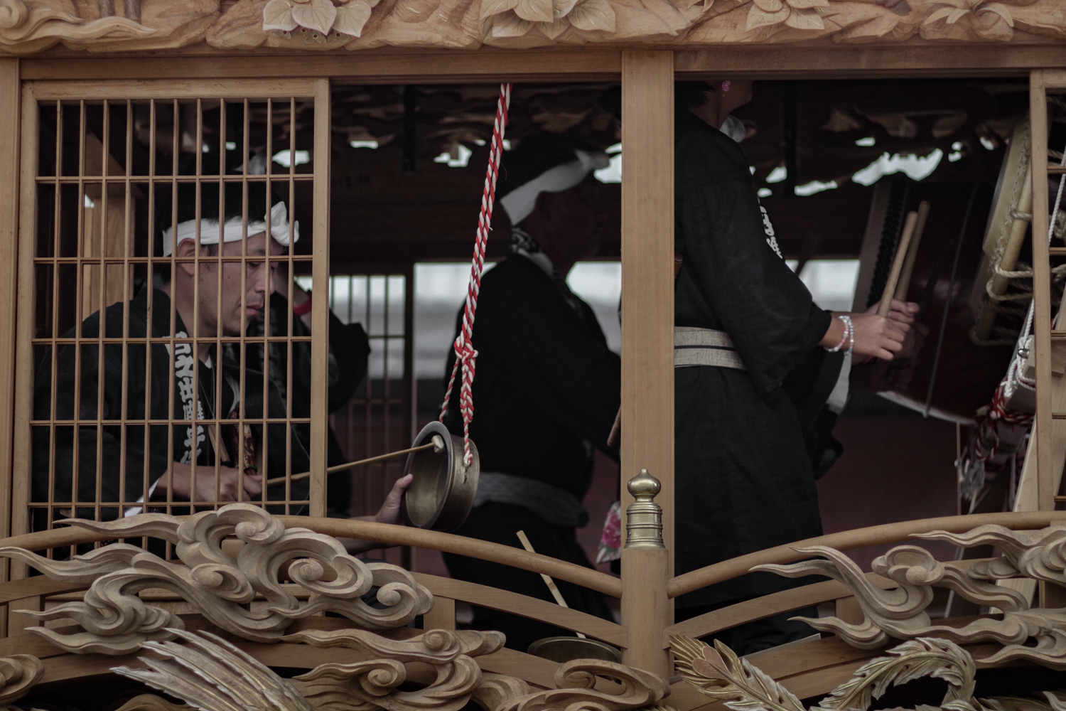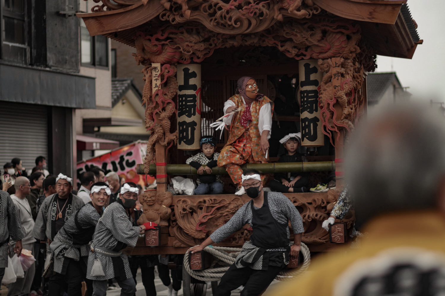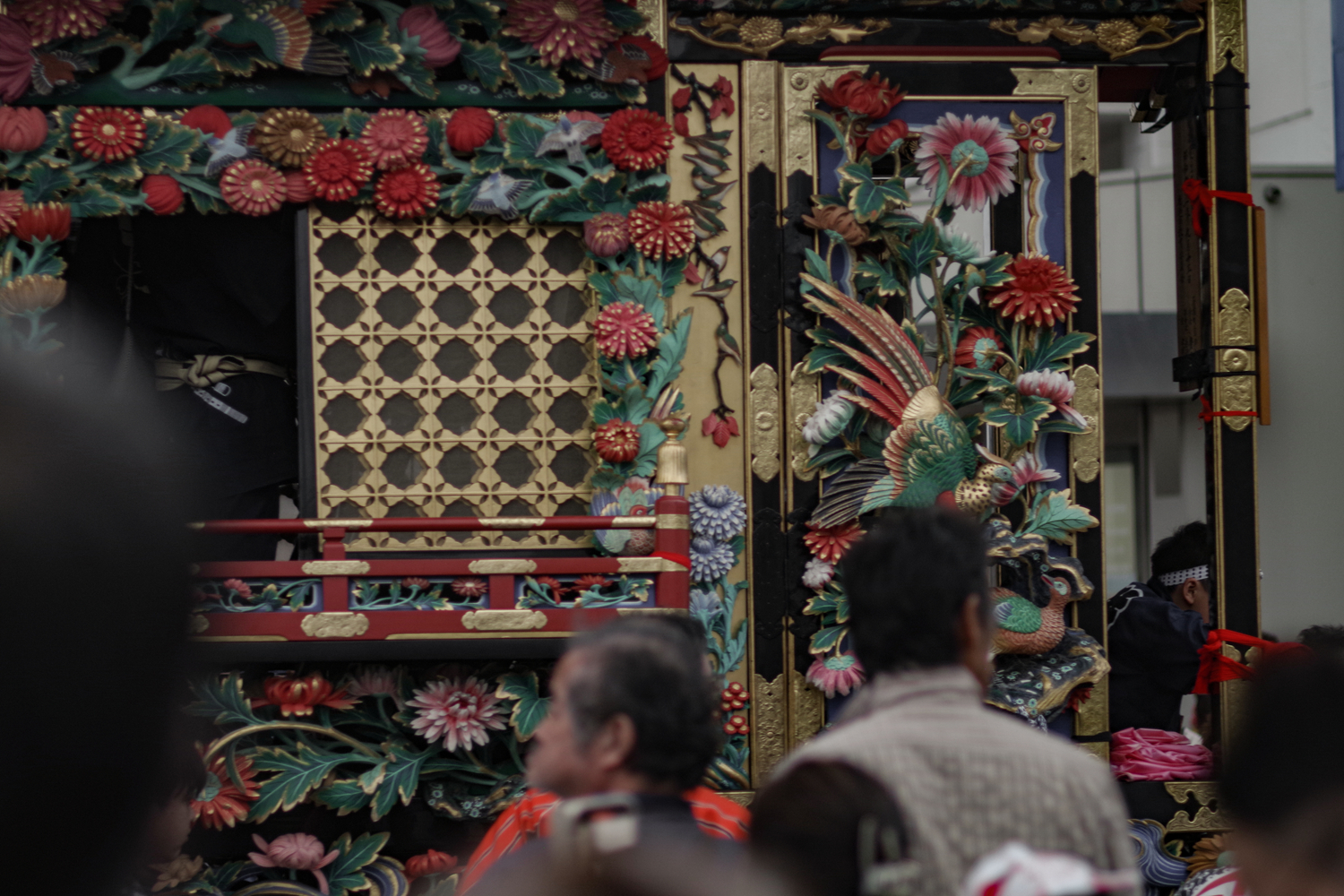彩車巡遊的部分,每個街道町出一輛花車,一共27輛。每個花車都雕梁畫柱,各有特色,前方往往坐著小朋友,後方則是囃子樂師表演的空間