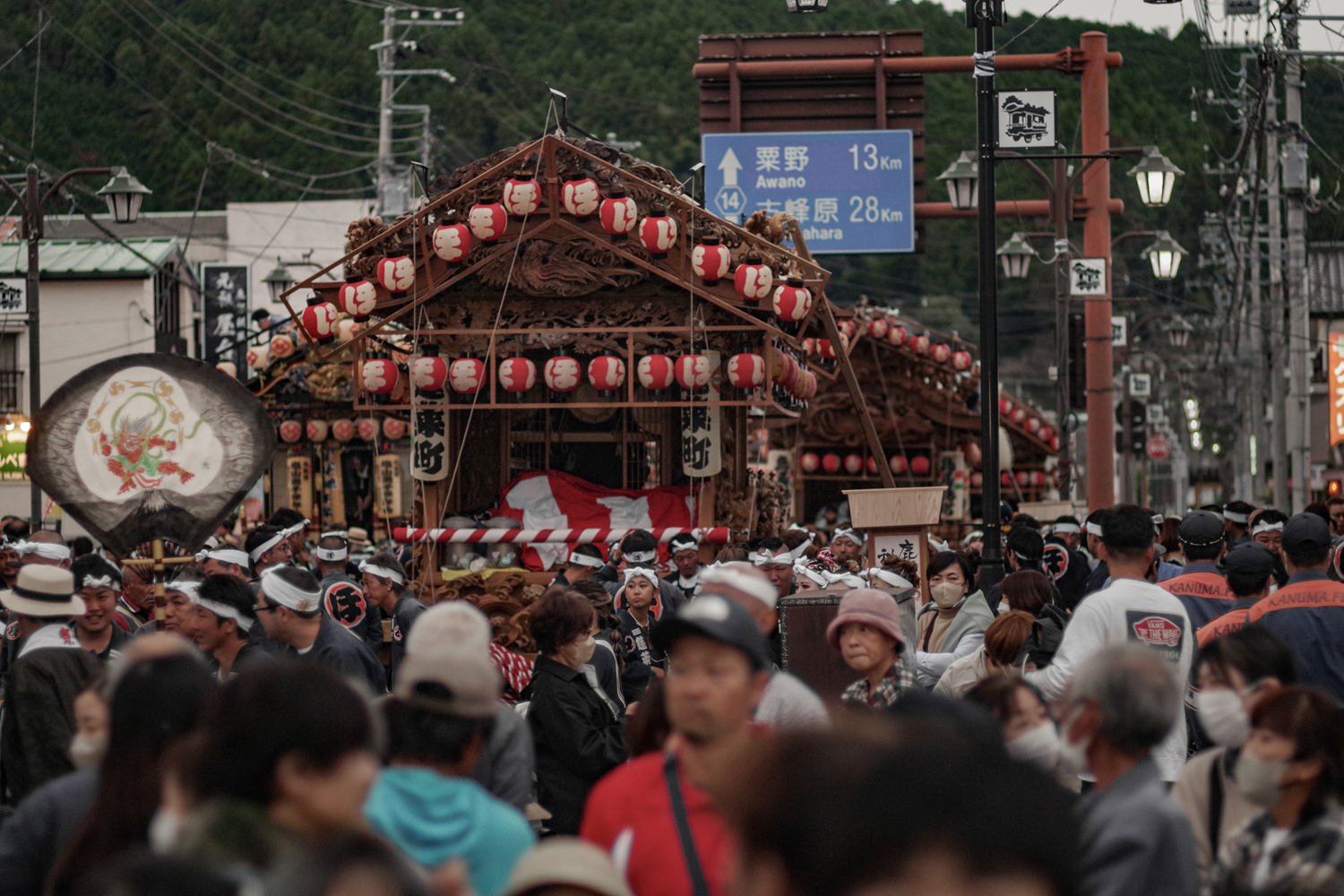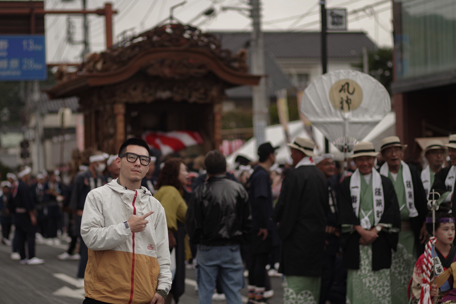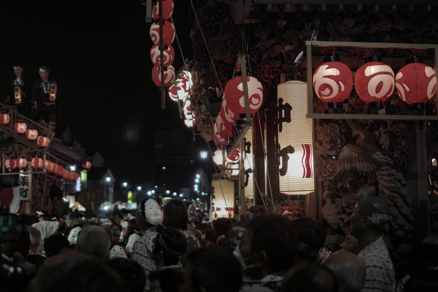 彩車巡遊的部分,每個街道町出一輛花車,一共27輛。每個花車都雕梁畫柱,各有特色,前方往往坐著小朋友,後方則是囃子樂師表演的空間